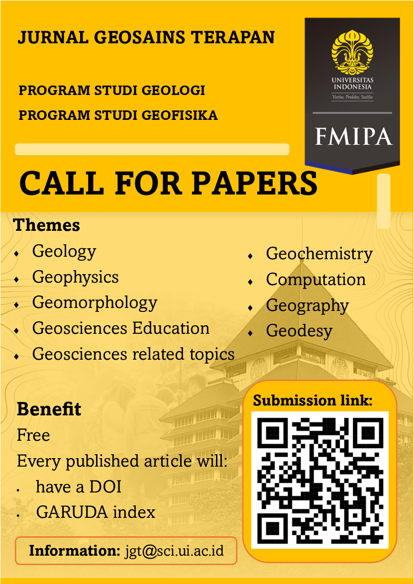 Jurnal Geosains Terapan (J.Geos T.) adalah jurnal nasional yang dipublikasikan dua kali dalam setahun, diterbitkan setiap bulan Februari dan Agustus oleh Program Studi Geologi dan Geofisika FMIPA UI. Jurnal Geosains Terapan memberikan kesempatan bagi kontributor untuk menuliskan paparan ilmiah dalam mendukung atau berhubungan dengan ilmu kebumian, meliputi: geologi, geofisika, geografi fisik, geodesi, geomorfologi dan terapannya. Jurnal Geosains Terapan akan dipublikasikan dalam bentuk buku jurnal dan jurnal online